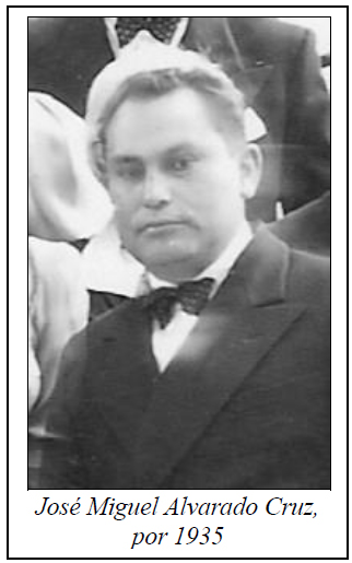 VIII. MIGUEL ALVARADO BARRERA, nacido por 1852. Estaba dedicado a la agricultura y era alfabeto. Casó el 25 de septiembre de 1875[10] con Ana Flores Martínez, mujer de hermosos ojos azul-cardenillo, era hija legítima de Francisco Flores y de Manuela Martínez, y había sido bautizada el 12 de enero de 1858, habiendo sido su madrina Isabel Almeida. Hijos: